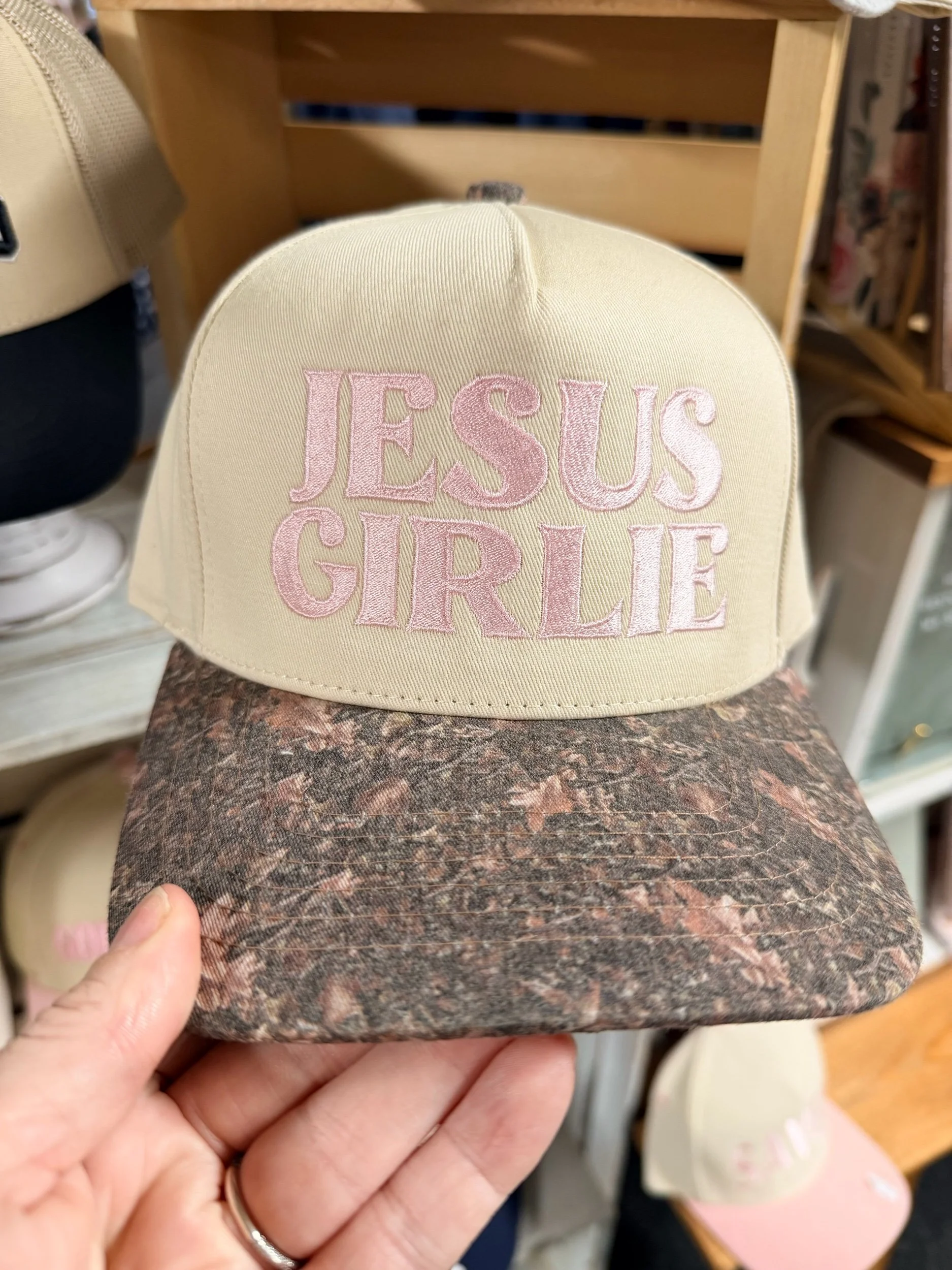 Tell the world who you follow with our Jesus Girlie hat! Pink writing on a cream and camouflage brim hat.